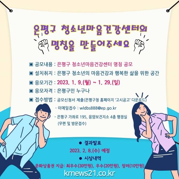 ▲ 사진=은평구 청소년마음건강센터의 명칭을 만들어주세요!서울 은평구(구청장 김미경)가 2023년 3월 개소 예정인 ‘청소년마음건강센터’에 어울리는 명칭을 신정하고자 오는 29일까지 명칭 공모를 실시한다고 밝혔다.