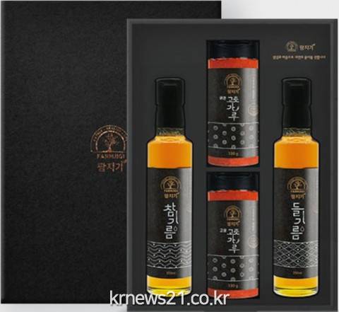 선물 세트는 총 2종이며 △참기름(250㎖, 1EA)과 들기름(250㎖, 2EA)으로 구성된 선물 세트는 11만원 △참기름(250㎖, 1EA), 들기름(250㎖, 1EA), 고운 고춧가루(130g, 1EA), 굵은 고춧가루(130g, 1EA)로 구성된 선물 세트는 9만9000원으로 출시됐다.