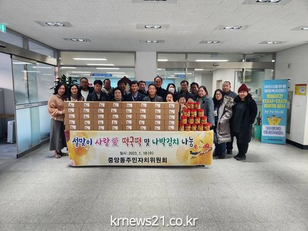 주민자치위원회 조봉행 위원장은 “설 명절에 힘든 이웃들에게 맛있는 떡국을 해먹어서 더욱 풍족한 설명절을 보내셨으면 하는 마음을 담아 전달하게 되었다.”고 소감을 전했다. 또한 중앙동 부녀회(부녀회장 길경숙)에서도 손수 직접 나박김치를 만들어 어려운 이웃들에게 나눠달라고 중앙동 행정복지센터에 기탁했다. 부녀회장 길경숙회장은 “거창한 선물은 아니지만 그래도 힘든 가정이신 분들이 조금이나마 따뜻한 설명절을 보냈으면 하는 마음에 자원하여 기탁하게 됐다. 올해는 좋은일만 가득하시길 바란다” 라고 소감을 전했다.