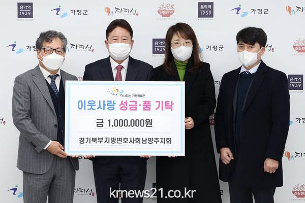 가평군은 코로나19 등으로 나눔의 행렬이 줄어든 가운데 다가오는 설 명절을 맞아 경기북부 지방변호사회 남양주지회(회장 심찬섭)에서 이웃돕기 성금 100만원을 기탁했다고 19일 밝혔다.