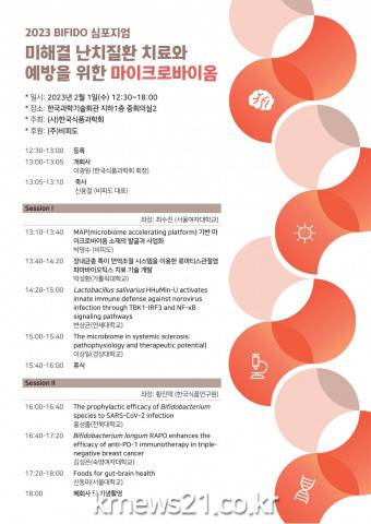 ‘미해결 난치질환 치료와 예방을 위한 마이크로바이옴’이라는 주제로 열리는 이번 심포지엄에서 마이크로바이옴이 여러 바이러스, 뇌기능, 류마티스관절염, 전신경화증, 폐섬유화증 등 여러 질환에 대한 치료와 예방 효과에 대한 연구성과를 소개할 예정이다.