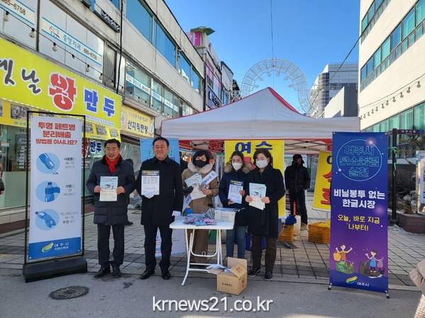 ▲ 여주시, 설 맞이 장바구니 나눔 캠페인 실시여주시는 1월 20일 설 명절 대목 오일장에, 여주시민 및 한글시장 방문객을 대상으로 탄소중립 생활을 실천할 수 있는 휴대가 편리하고 지속적으로 사용할 수 있는 장바구니 나눔 캠페인을 실시했다.