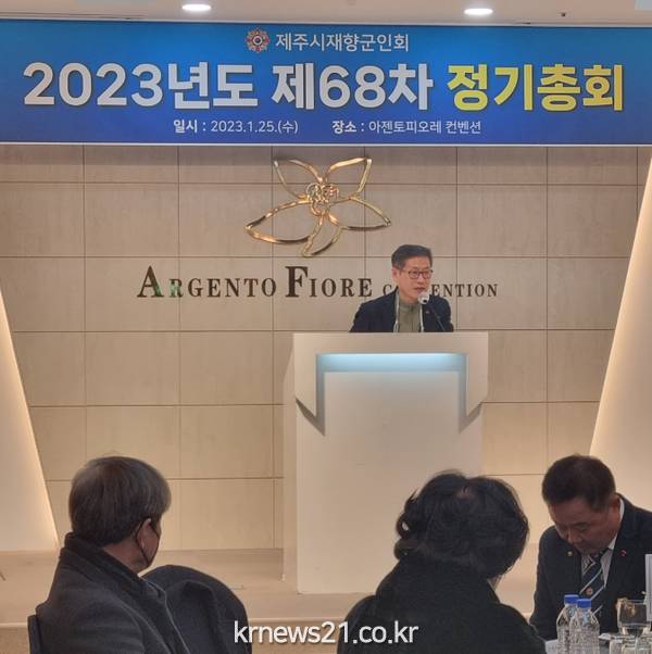▲ 사진=제주시안우진 제주시 부시장은 1. 25.(수) 아젠토피오레컨벤션에서 개최된 2023년 제68차 제주시재향군인회 정기총회에 참석하여 향군회원들을 격려하였다.