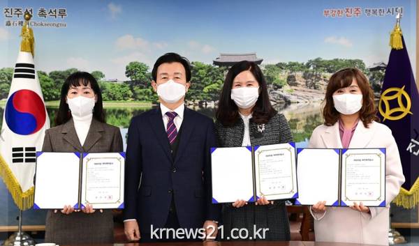 ▲ 사진=진주시청진주시는 27일 시청 기업인의 방에서 조규일 시장이 참석한 가운데 국공립어린이집 위탁체 3개소의 위탁 운영자에게 위탁계약증서를 전달했다.