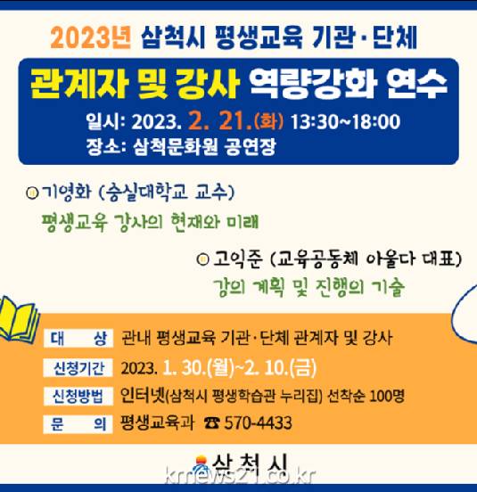 이번 연수는 평생학습도시 삼척의 최일선에서 리더 역할을 하고 있는 평생교육 기관·단체 관계자 및 강사의 역량강화와 전문성 향상을 위한 차별화 전략으로 기영화 숭실대학교 교수와 고익준 교육공동체 아울다 대표를 초빙하여 『평생교육 강사의 현재와 미래』 및 『강의 계획 및 진행의 기술』이라는 주제로 2월 21일(화) 13시 30분부터 18시까지 삼척문화원 공연장에서 진행된다.