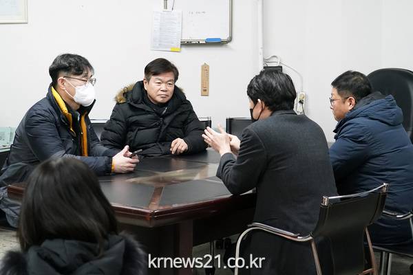 ▲ 사진=배관 동파사고 발생 아파트 입주자대표를 만나 논의하는 이필형 동대문구청장(왼쪽 두 번째)이필형 동대문구청장이 29일 오후 보일러 배관 동파사고가 발생한 청량리동 소재 아파트를 찾아 추위에 노출된 주민들을 위로했다.