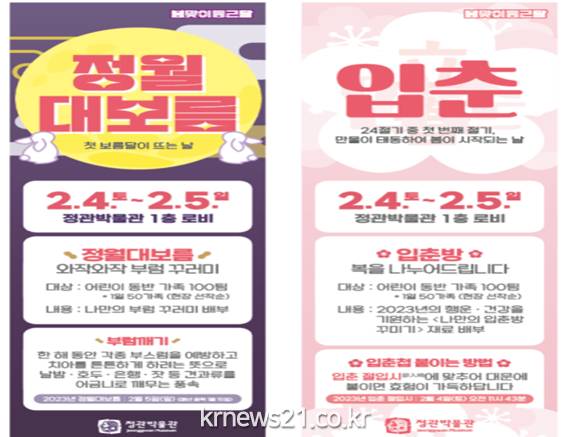 이틀간 오전 10시부터 오후 5시까지 전시실 1층 로비에서 진행되는 <봄맞이 둥근달> 행사는 세시풍속을 체험하는 ▲‘입춘첩-복을 나누어 드립니다’. ▲‘정월대보름-와작와작 부럼 꾸러미’, 두 가지 행사로 진행될 예정이다.