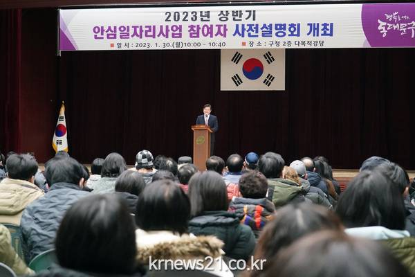 ▲ 사진=이필형 동대문구청장이 30일 오전 구청 2층 다목적강당에서 안심일자리사업 사전설명회에 참석해 참여자들을 격려하고 있다.동대문구(구청장 이필형)가 30일 오전 10시 2023년 상반기 안심일자리사업 참여자를 대상으로 사전설명회를 개최했다.