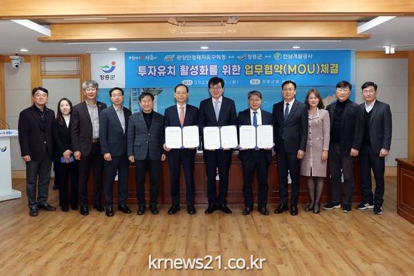 장흥군이 전남개발공사, 광양만권경제자유구역청과 투자유치 활성화와 일자리 창출을 위해 업무협약을 체결했다.