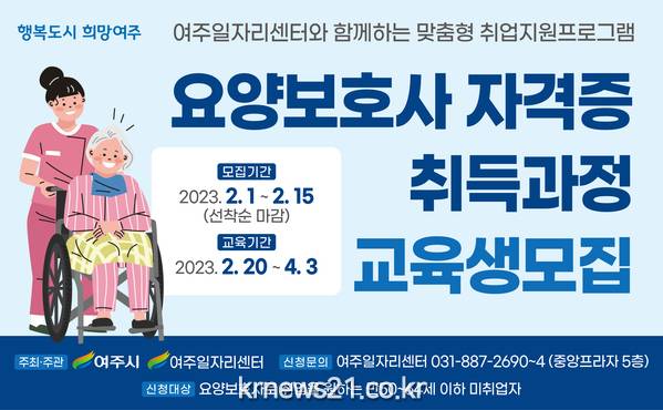 여주시(시장 이충우)는 2월 1일부터 2월 15일까지 여주일자리센터에서 2023 요양보호사 자격증 취득과정 교육생을 모집한다고 밝혔다.
