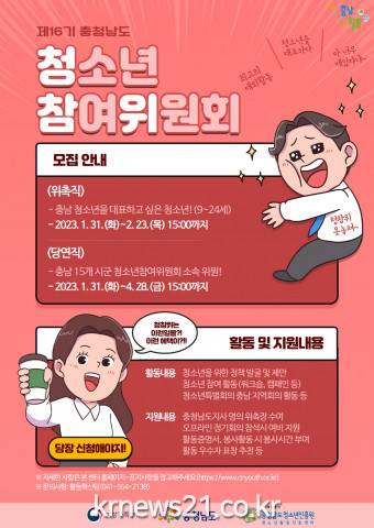 ▲ 사진=충청남도청소년진흥원충청남도청소년진흥원(원장 직무대리 이순실) 활동진흥센터는 2월 23일까지(당연직은 4월 28일까지) 2023년 제16기 청소년참여위원회 위원을 모집한다고 밝혔다.