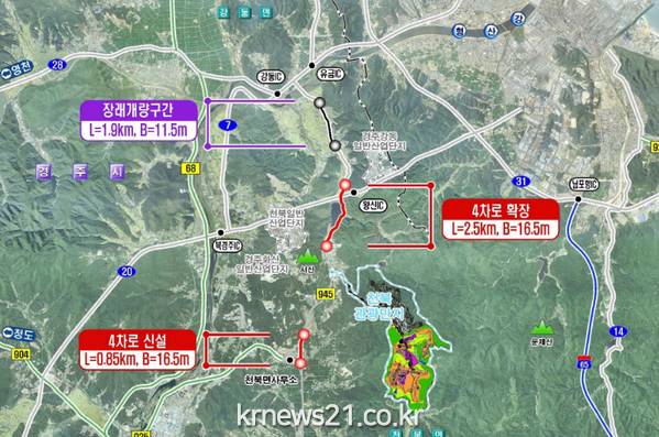지방도 945호선의 확장 공사는 ‘강동~보문 간 도로’ 전체 21㎞ 구간 중 3.35㎞를 우선 시행하는 사업으로 총 사업비 300억원이 투입된다.
