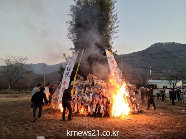 달집태우기는 오후 5시경 농악 길굿을 시작으로 사성암 우현 스님의 축원문 낭독과 면민 안녕과 풍년을 기원하는 제례 후, 달집에 점화가 되는 순간 참석한 사람들의 함성과 함께 용솟음치는 듯한 불길이 온 하늘을 뒤덮었다.