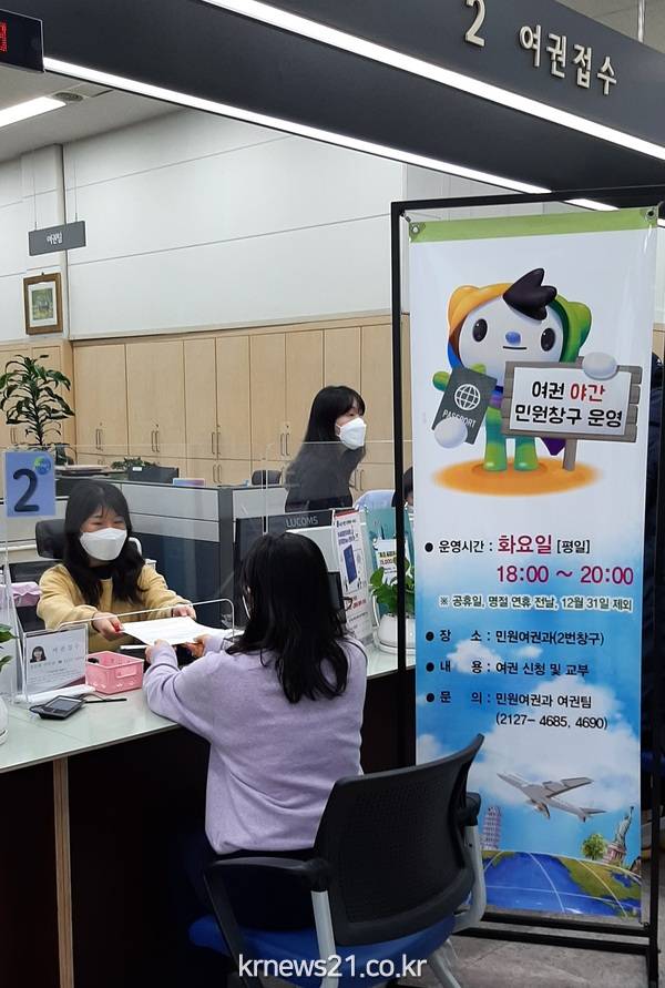 최근 코로나19 사태 안정화로 해외여행 수요가 급증하면서 여권 발급 신청을 위해 야간민원실을 이용하는 구민의 수가 늘어나고 있다. 야간민원실을 통해 올해 접수된 여권 신청 건수는 17일 기준 148건으로 전년도 같은 기간 대비 10배 가까이 증가했다.