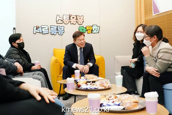 ▲ 사진=이필형 동대문구청장(사진 가운데)이 구에 거주 중인 다자녀가정 부모들을 초청해 대화를 나누고 있다.동대문구(구청장 이필형)가 다자녀가정의 출산과 양육 노고를 위로하고 격려하기 위해 7일 오후 4시 다자녀가정 부모 8명을 초청해 구청 지하1층 쉼뜨락에서 간담회를 진행했다.