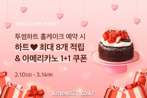 투썸플레이스는 밸런타인데이와 화이트데이 시즌을 맞아 준비한 이벤트로, 홀케이크 전일 예약 서비스 도입 1주년을 기념하며 더 풍성한 혜택을 마련했으니 투썸플레이스 홀케이크와 함께 사랑하는 사람에게 달콤한 마음을 전하길 바란다고 밝혔다.