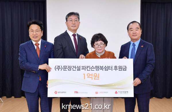 ▲ 사진=광주광역시광주광역시(시장 강기정)는 9일 ㈜문장건설이 파킨슨병 환자들의 복지증진을 위해 성금 1억원을 기부했다고 밝혔다.