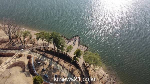 시는 기흥저수지를 찾는 이용객들이 산책 중 노을을 조망하며 여유를 즐기고 포토존으로도 활용할 수 있도록 5억원을 투입, 나뭇잎 모양의 전망데크를 설치했다.
