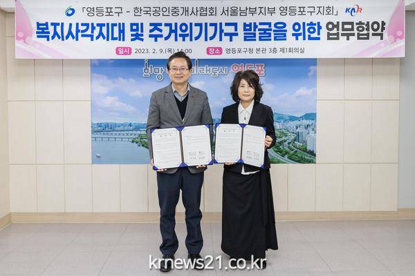 영등포구(구청장 최호권)가 지난 9일 한국공인중개사협회 영등포구지회와 사회적 위기가구 발굴을 위한 명예사회복지공무원 업무협약(MOU)을 맺었다고 밝혔다.
