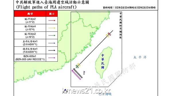 타이완 자유시보(自由時報)는 13일 타이완 국방부 발표를 인용해 전날 오전 6시부터 이날 오전 6시까지 타이완군이 타이완 주변 공역과 해역에서 중국 인민해방군 소속 군용기 18대와 군함 4척을 포착했다고 보도했다.