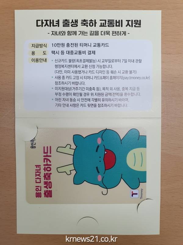 ▲ 사진=용인특례시가 다자녀 출생 축하를 위해 교통비 10만원을 지원한다용인특례시(시장 이상일)는 다자녀 출생 가정의 교통비 부담을 덜어주기 위한 출산 정책으로 올해부터 ‘용인 다자녀 출생축하교통카드’ 지원 사업을 시행한다고 14일 밝혔다.