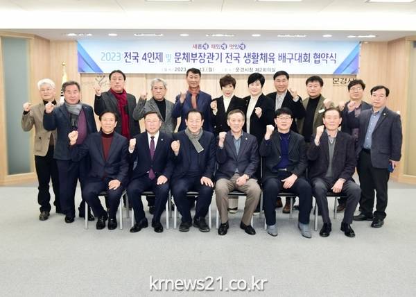 ▲ 사진=문경시청문경시(시장 신현국)는 지난 13일 「2023 전국 4인제 배구대회」 및 「문체부장관기 전국 생활체육 배구대회」의 성공적인 개최를 위하여 대한배구협회·한국9인제배구연맹과 업무협약을 체결했다.