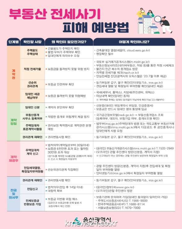 또한 울산시는 이같은 전세 사기 피해 예방법, 전세보증금 반환보증 가입제도 등에 대해서 많은 시민들이 알 수 있도록 시와 구․군, 협회 누리집과 에스엔에스(SNS) 등을 통해 홍보에 최선을 다하고 있다.