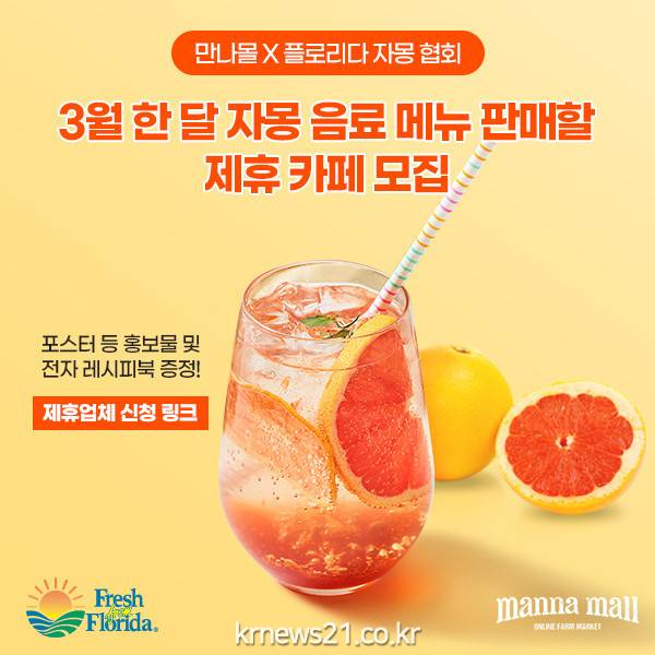 과일 유통 회사인 진원무역은 매년 플로리다 자몽협회와 함께 시즌 마케팅 활동을 진행하고 있다. 이번 제휴 카페 모집에 선발된 카페에는 플로리다 자몽을 활용한 시즌 음료 레시피를 담은 전자책을 제공한다. 해당 레시피 가운데 일부는 유튜브 커픽처스와 협업을 통해 개발됐다.