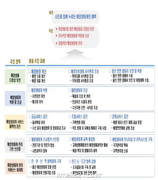 전략별 과제를 보면 △해양생물 다양성 보전(해양환경 개선, 해양보호생물 서식환경 조성, 연안 생태축 보전 및 복원) △해양생태계 복원 및 조성(자연암반 개선, 해중림 조성 및 인공어초 관리 등) △해양생태계 서비스 혜택의 증진(공급, 조절, 문화서비스 증진) 등이 마련됐다.