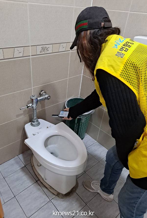 ▲ 사진=불법촬영 시민감시단이 공중화장실 내 불법촬영기기 설치를 점검하고 있다. 마포구(구청장 박강수)가 오는 21일까지 지역 내 불법촬영 예방활동에 참여할 ‘불법촬영 시민감시단’을 모집한다고 밝혔다.