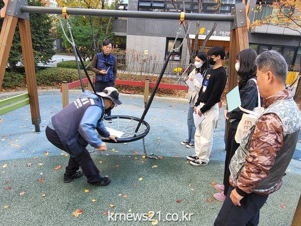 ▲ 사진=어린이놀이시설 안전실태 점검 중인 동대문구청 관계자동대문구(구청장 이필형)는 2023년 신학기를 맞이하여 어린이 놀이시설의 체계적인 안전점검을 통해 사고 없는 안전한 환경을 조성하고자 관내 어린이놀이 시설에 대한 전수점검을 실시한다고 전했다.