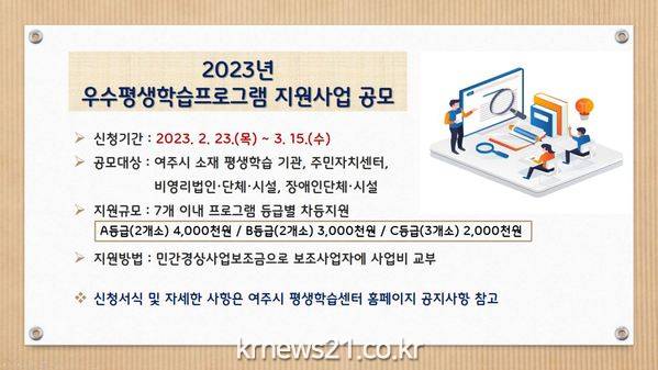 공모대상은 여주시 소재 평생학습 기관, 주민자치센터, 비영리법인·단체·시설, 장애인단체·시설로, 심사를 통해 7개 이내의 우수평생학습프로그램을 선정하여 차등 지원할 예정이다. [A등급(2개소) 4,000천원, B등급(2개소) 3,000천원, C등급(3개소) 2,000천원]