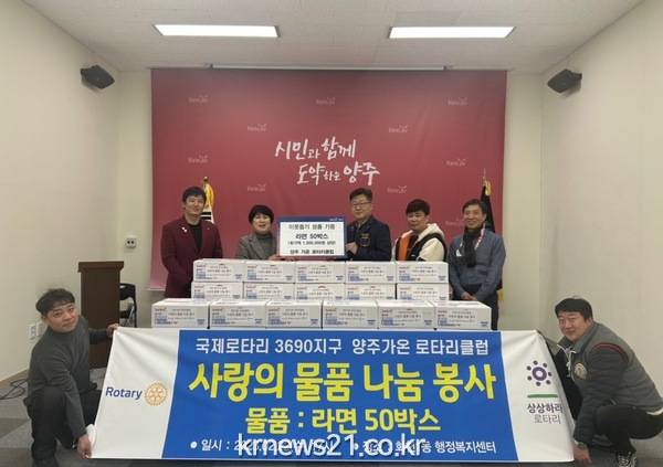 ▲ 양주가온 로타리클럽, 양주시 회천1동에 이웃돕기 물품 전달양주시 회천1동(동장 배용숙)은 지난 22일 양주가온 로타리클럽(회장 김선훈)에서 동 행정복지센터를 방문해 관내 취약계층과 소외 이웃들을 위해 라면 50박스(환가액 100만원)를 기부했다고 밝혔다.