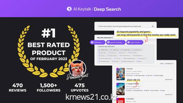 ▲ 사진=마이셀럽스마이셀럽스의 인공지능(AI) 영화 검색 추천 툴 ‘AI 키토크 무비 딥서치’가 세계 최대 소프트웨어 론칭·평가 플랫폼인 프로덕트 헌트(Product Hunt)에서 1746개의 글로벌 소프트웨어 제품들을 제치고 ‘2월의 최고 평가 제품(Best rated product of February)’ 1위에 올랐다.