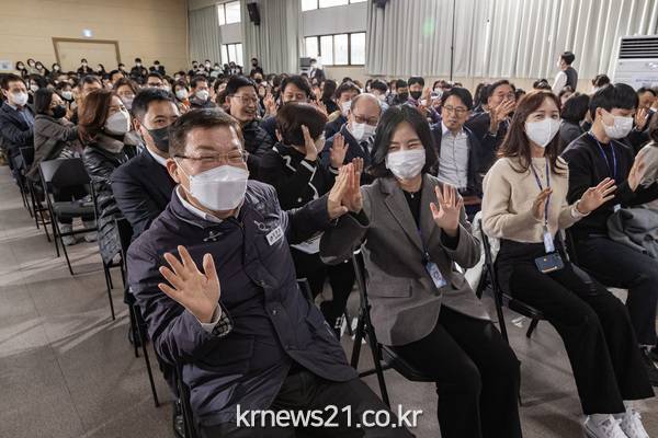 이어서 김경호 구청장이 정겨운 인사말과 함께 소통을 시작했다. 후배 직원들과 눈을 맞추며 “직원 모두의 노력으로 고질적인 민원들이 하나씩 해결되고, 12년 만에 종합청렴도가 2등급으로 향상하는 등 값진 변화들이 이뤄지고 있다”라며, “더욱 책임감을 갖고 성심껏 소통하면서 공정하고 투명한 조직문화를 만들겠다”라고 포부를 전했다.