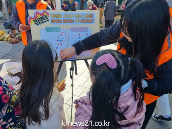 이날 구례군장애인복지관은 오일장 관광객과 상인들을 대상으로 장애 관련 상식을 OX퀴즈로 풀어보면서 장애에 대한 객관적인 정보를 제공했다.