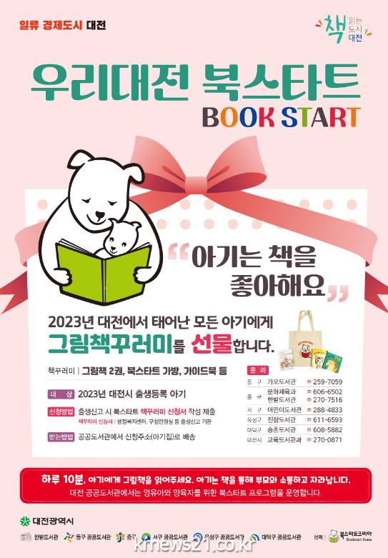 ‘2023 우리대전 북스타트’는 올해 대전에서 태어날 아기(약 7,000여 명)를 대상으로 대전시와 5개 자치구, 행정복지센터, 공공도서관, 출생신고 등록 의료기관 등 100여 개의 기관이 협력하여 추진한다. 광역시 중 당해 년도에 태어나는 모든 아기 대상의 북스타트는 대전시가 유일하다.