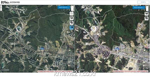 ▲ 사진=시 공간정보포털에 구축된 삼가동 일대 2022년 항공사진과 2015년 항공사진용인특례시(시장 이상일)는 시민 누구나 활용할 수 있도록 용인시 공간정보포털(gis.yongin.go.kr)사이트에서 고해상도 항공사진과 공간정보를 알 수 있는 수치지형도를 제공한다고 7일 밝혔다.
