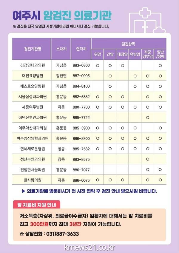 ▲ 여주시, 2023년 국가암검진 집중 홍보 실시여주시보건소(소장 최영성)는 우리나라 사망원인 1위인 암의 조기발견 및 조기치료를 위해 국가 암 검진 대상자에게 ‘국가암검진’ 홍보에 나섰다고 밝혔다.