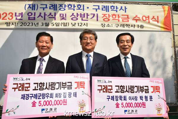 지난 5일 열린 2023년 구례학사 입사식 및 상반기 장학금 수여식과 함께 진행된 고향사랑기부제 기탁금 전달식에서 김광태 회장과 박형문 이사장은 각 500만 원씩을 구례군에 기탁하였다.