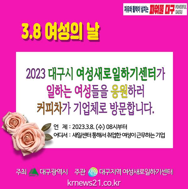 오는 3월 8일(수)은 여성새로일하기센터 5개소 직원과 (사)대구여성단체협의회 회원 등 50여 명이 직접 기업체를 방문해 출근길과 점심시간을 이용하여 근로자 1,200여 명에게 커피차에서 커피, 쿠키, 지역브랜드 빵과 꽃 화분을 전달하며 일과 생활이 조화로운 기업문화가 정착될 수 있도록 기업과 남녀 근로자를 응원할 예정이다.