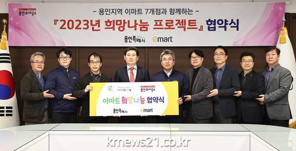 ▲ 사진= 용인특례시는 지난 8일 시장 접견실에서 관내 이마트 7개점과 관내 저소득층을 지원하는 ‘2023 희망나눔 프로젝트’ 업무협약을 체결했다.용인특례시(시장 이상일)가 올해도 관내 이마트 7개 점과 ‘2023년 희망나눔 프로젝트’를 이어간다.