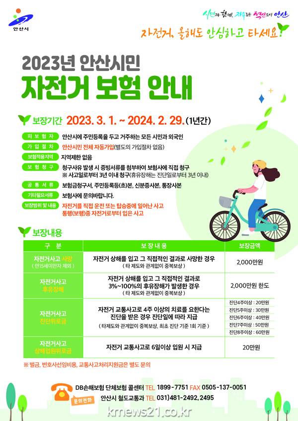 ▲ 모든 안산시민 대상 자전거 보험 자동 가입… 최대 2천만원 보장안산시(시장 이민근)는 시민들이 자전거를 안전하게 이용할 수 있도록 전 시민을 대상으로 자전거 보험에 가입했다고 9일 밝혔다.