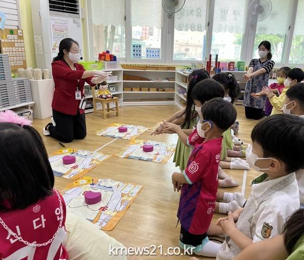 어린이들은 동영상을 시청하고 교구를 활용해 심폐소생술, 자전거 보호용구 착용, 횡단보호 건너기 등을 직접 체험한다.