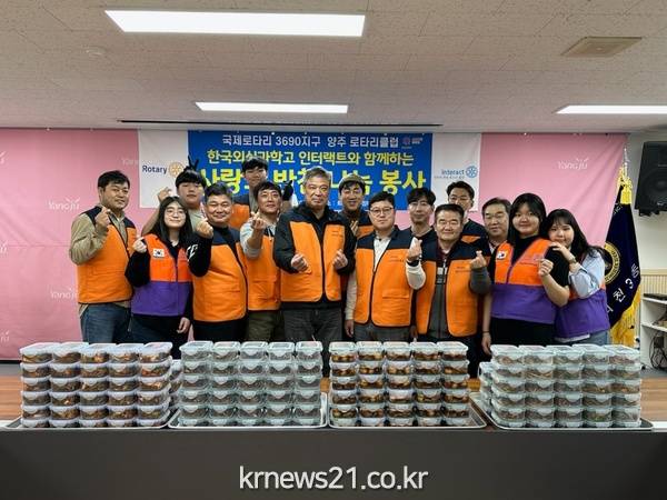 ▲ 양주시 국제로타리 3690지구 양주로타리클럽, 한국외식과학고 학생과 사랑의 반찬 나눔 봉사 실시양주시 회천3동(동장 김덕환)은 지난 11일 국제로타리 3690지구 양주로타리클럽(회장 이길한)과 한국외식과학고 인터랙트클럽 학생들이 관내 취약계층을 위해 사랑의 반찬 나눔 봉사활동을 실시했다고 밝혔다.