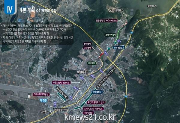시는 이번 사업을 통해 대천천 상류 구간은 야간조명, 수변공원 등을 조성해 하천 경관을 향상할 예정이며, 생태공간을 활용해 디딤돌 및 수생식물을 식재하고 생물서식처 반영 조류 쉼터 등을 조성해 쾌적한 친수공간을 형성할 계획이다.