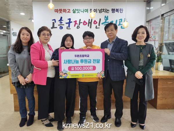 이번 후원금 50만원은 고흥군 소재의 두원초등학교에서 열린 바자회의 수익금으로 교직원과 아이들의 순수한 뜻이 담겼다. 두원초등학교는 후원 이유로 평소 장애 이해 교육을 고흥군장애인복지관에서 받았던 학생들이 장애인에게 지원된다면 좀 더 뜻깊은 바자회가 될 것 같다는 의견을 밝혀 후원하게 됐다고 설명했다.