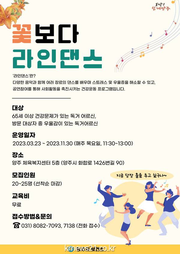 ▲ 양주시보건소, 홀몸 어르신 우울중재 프로그램 ‘꽃보다 라인댄스’ 운영양주시보건소(소장 이재환)는 오는 23일부터 관내 독거 어르신을 대상으로 ‘꽃보다 라인댄스’ 프로그램을 운영한다.