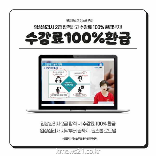 이번 이벤트는 원큐패스 임상심리사 2급 강의를 위탁 운영하고 있는 이노솔루션 교육센터에서 ‘원큐패스 임상심리사 2급 환급과정’을 수강 신청한 학습자를 대상으로 하며, 강의 수강 후 임상심리사 2급 자격증을 취득하면 수강료 전액을 환급받을 수 있는 이벤트다.