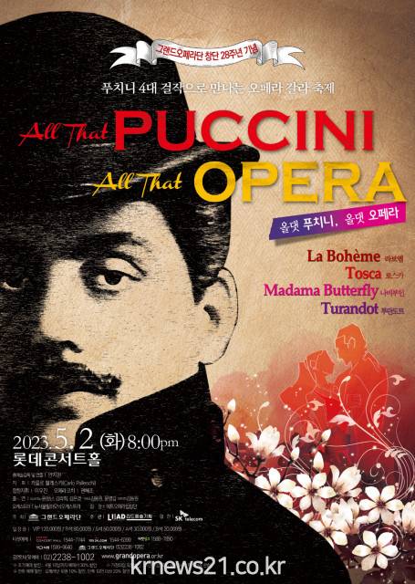 그랜드오페라단의 갈라 콘서트 ‘올댓 푸치니, 올댓 오페라’는 5월 2일 화요일 오후 8시 롯데콘서트홀에서 열린다. 관람문의 등 자세한 사항은 그랜드오페라단으로 문의하면 된다.